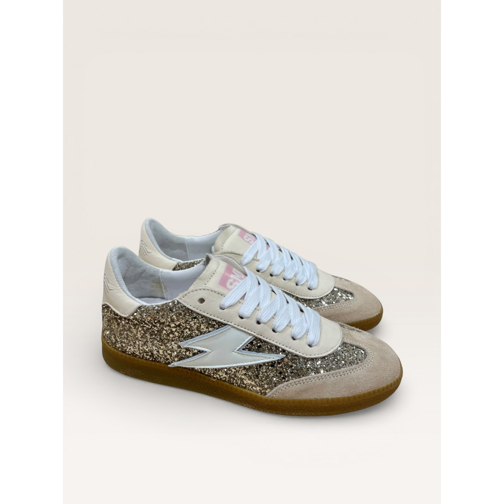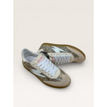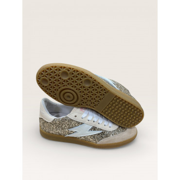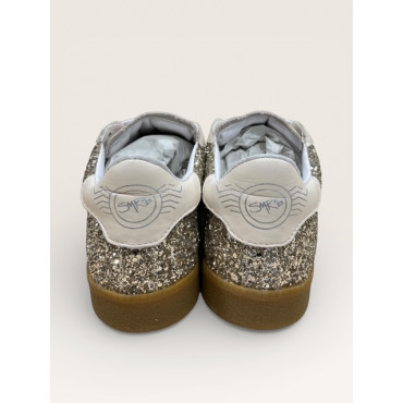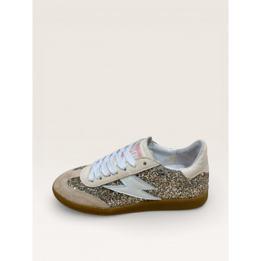 SMR 23 BASKET EMILY D325EN CUIR VELOURS BEIGE ET GLITTER DORE A LACETS BLANC