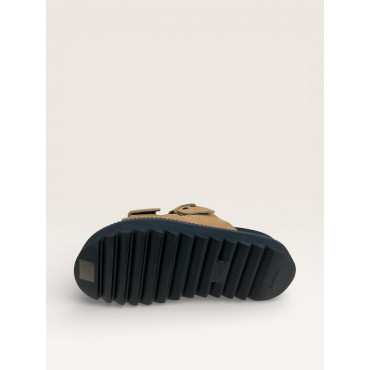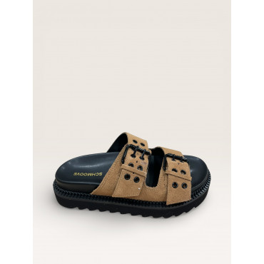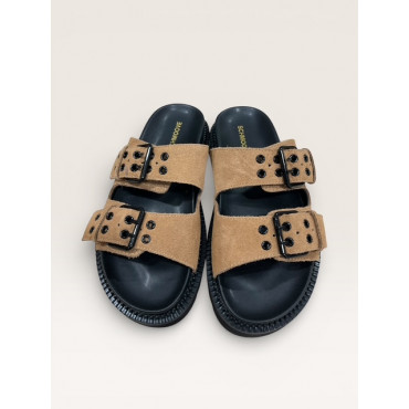 SCHMOOVE MULE STELLA BUCKLE EN CUIR VELOURS CAMEL A DOUBLE BRIDES